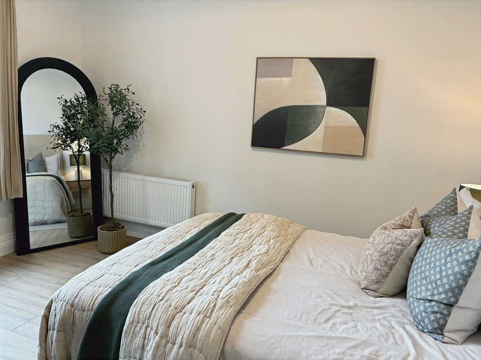Soft greens and natural neutrals were thoughtfully selected to reflect the tranquil beauty of the countryside setting